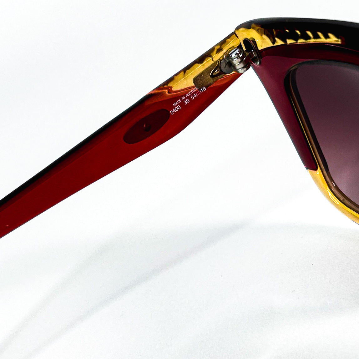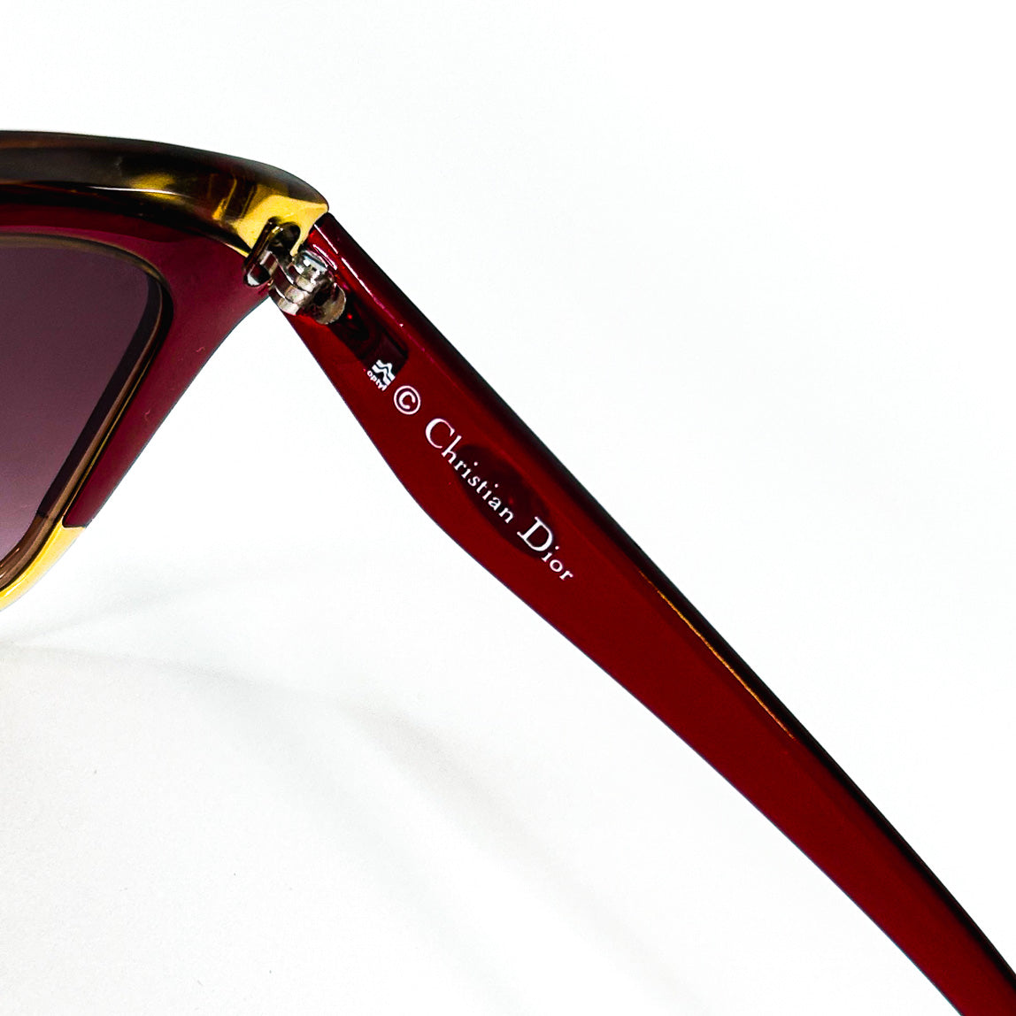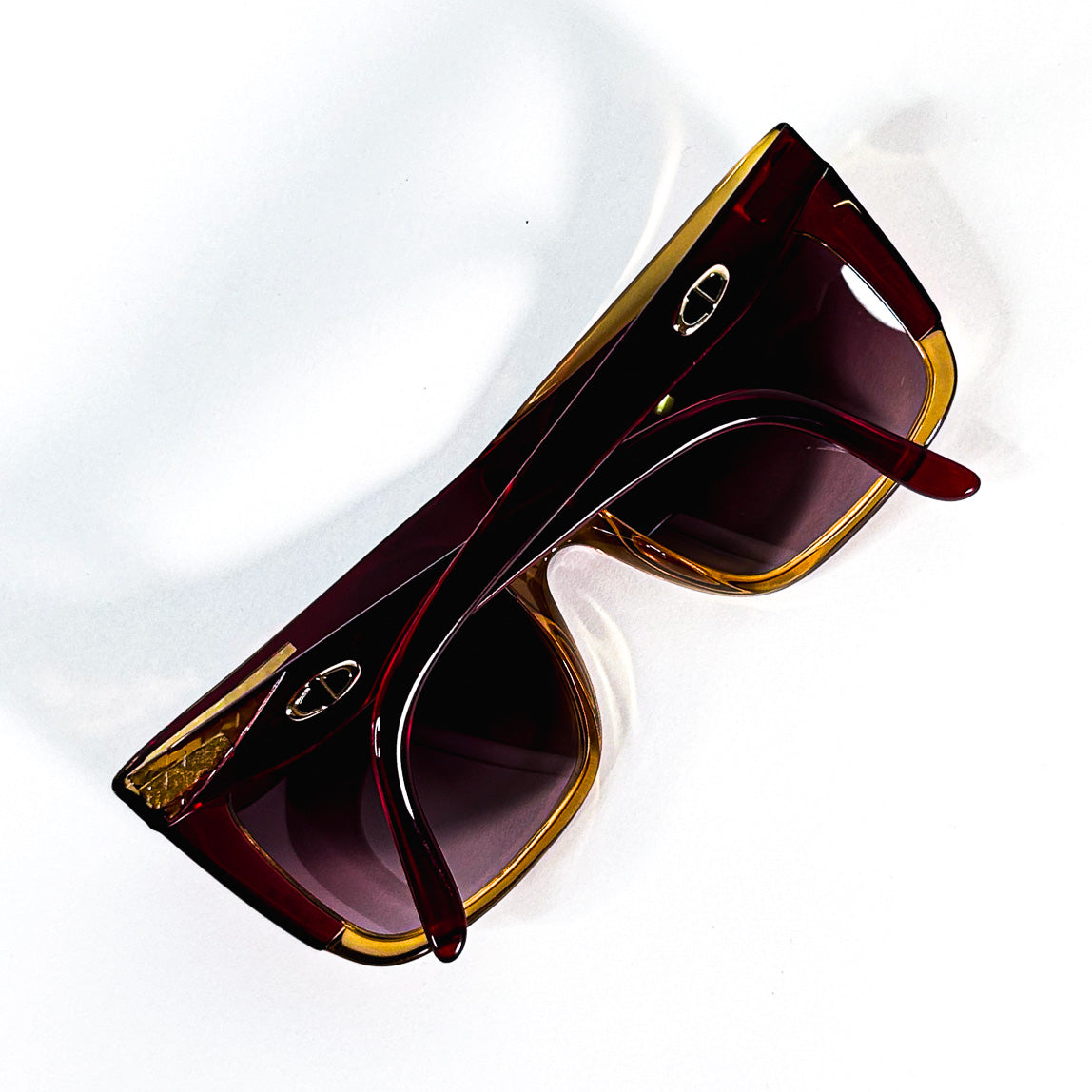 Lunettes Christian Dior 2100 30, forme carrée oversize, en acétate bicolore rouge et ambre, années 1980, logo CD métal ovale sur les branches.