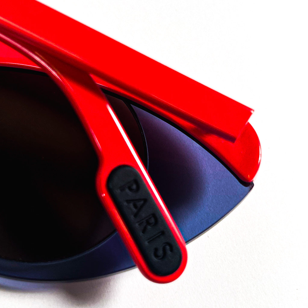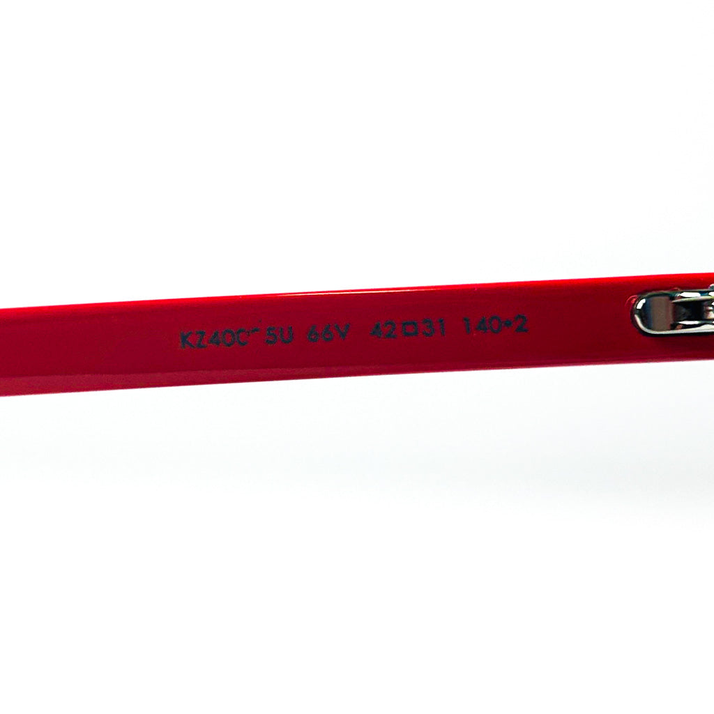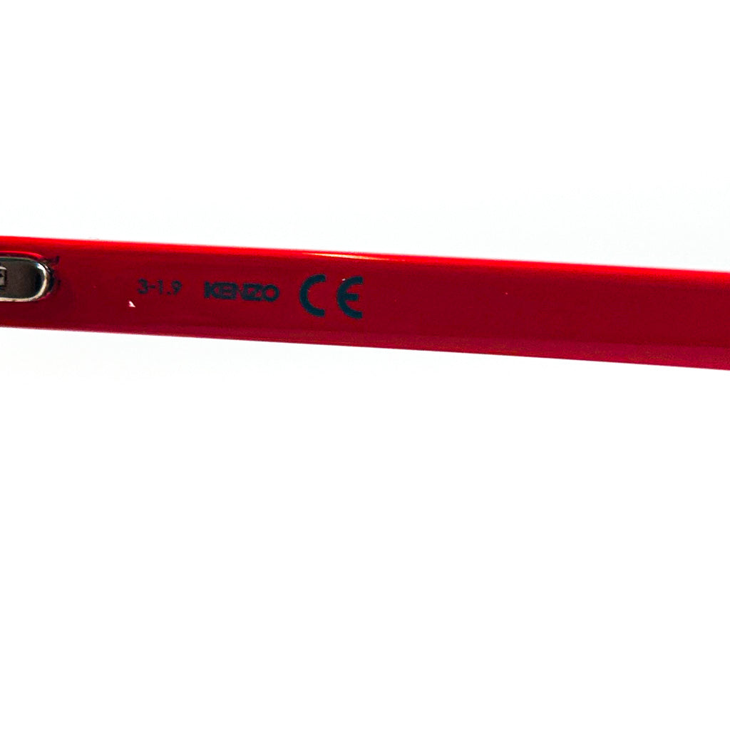 Monture Kenzo modèle KZ400C SU 66V, acétate rouge translucide (branches) et bleu foncé (face), forme œil-de-chat.