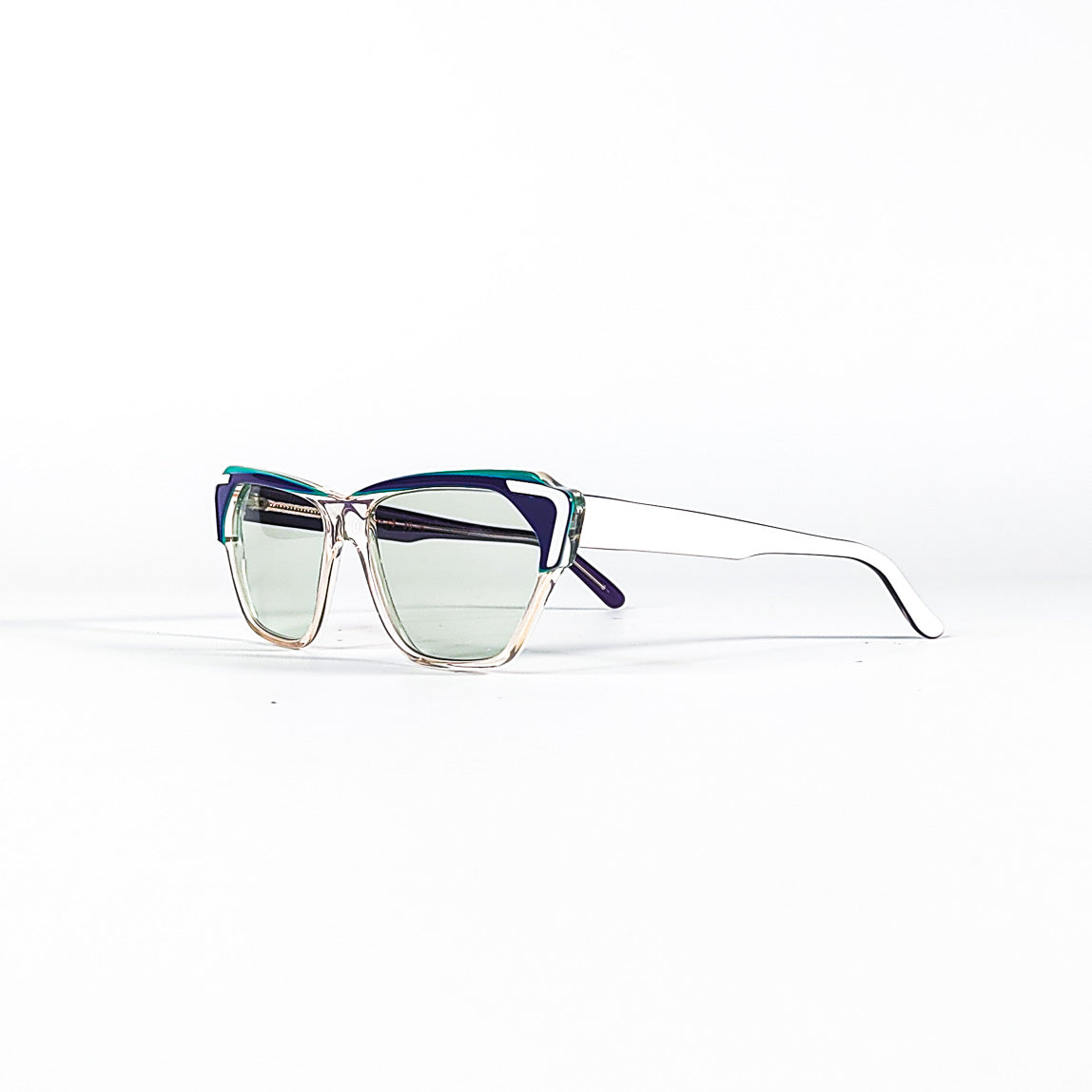 Lunettes de soleil Gérard Levet, fabriquée en France, incarne l’audace créative de la lunetterie indépendante des années 1980–1990. Monture anguleuse, superpositions d’acétate coloré et palette chromatique inattendue : un véritable témoignage du design postmoderniste à la française.