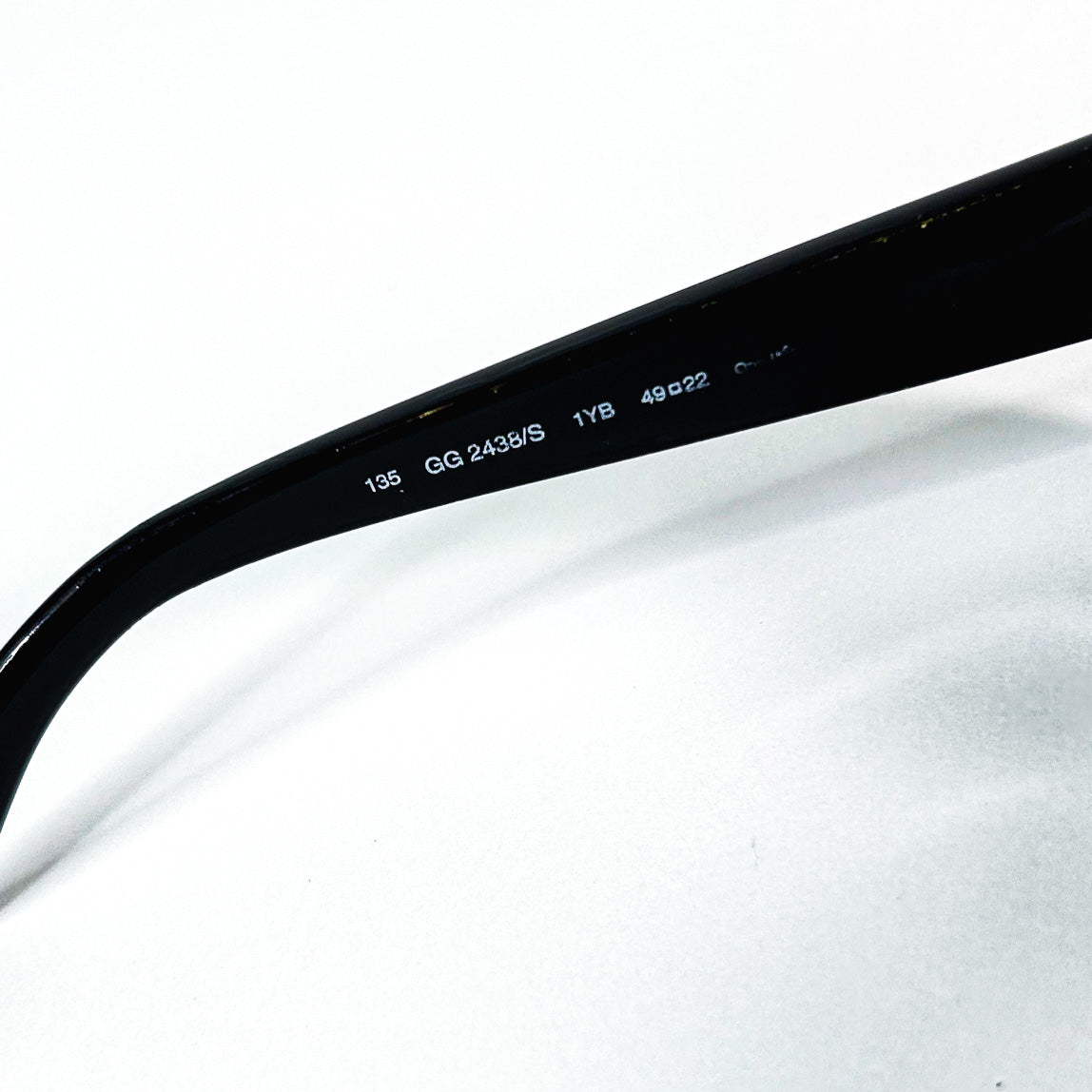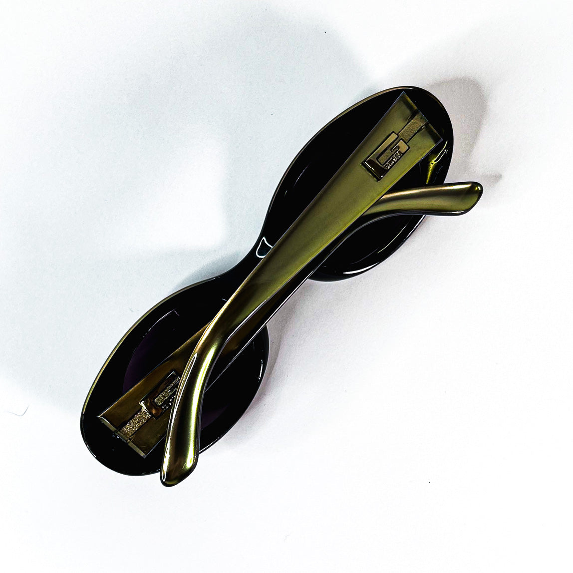 Lunettes Gucci GG 2438/S, forme ovale, en acétate vert olive translucide, années 2000, logo G gravé en métal doré sur les branches.