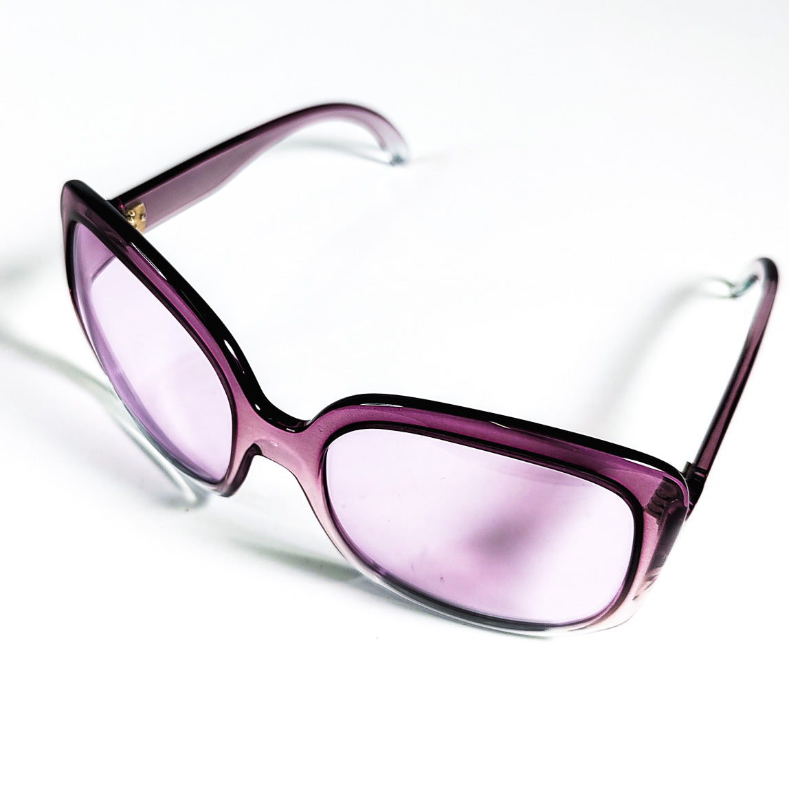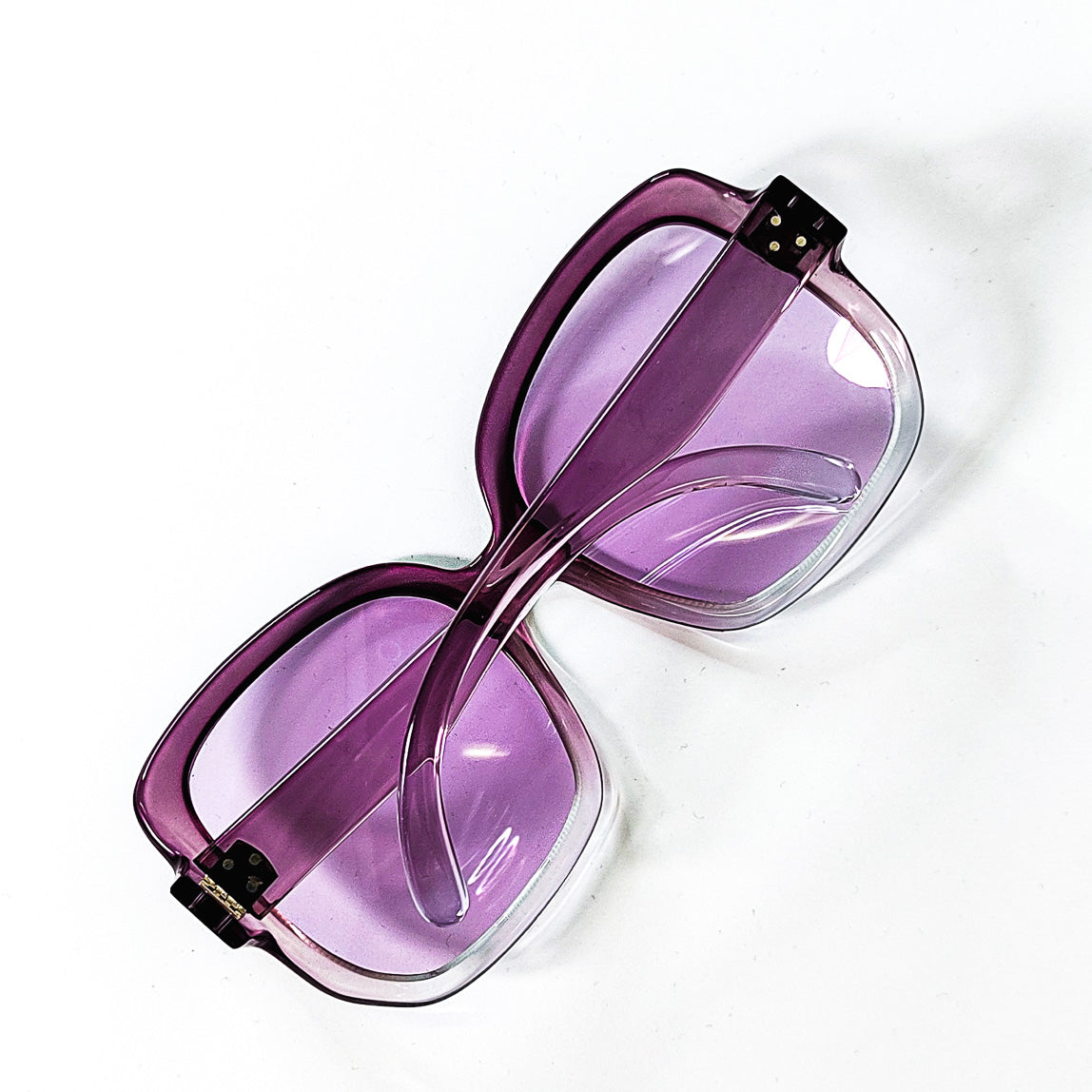 Monture en acétate violet transparent, large forme carrée oversize, charnières trois-barillets apparentes, années 1980 fabriquée dans les ateliers Jurassiens (Oyonnax).