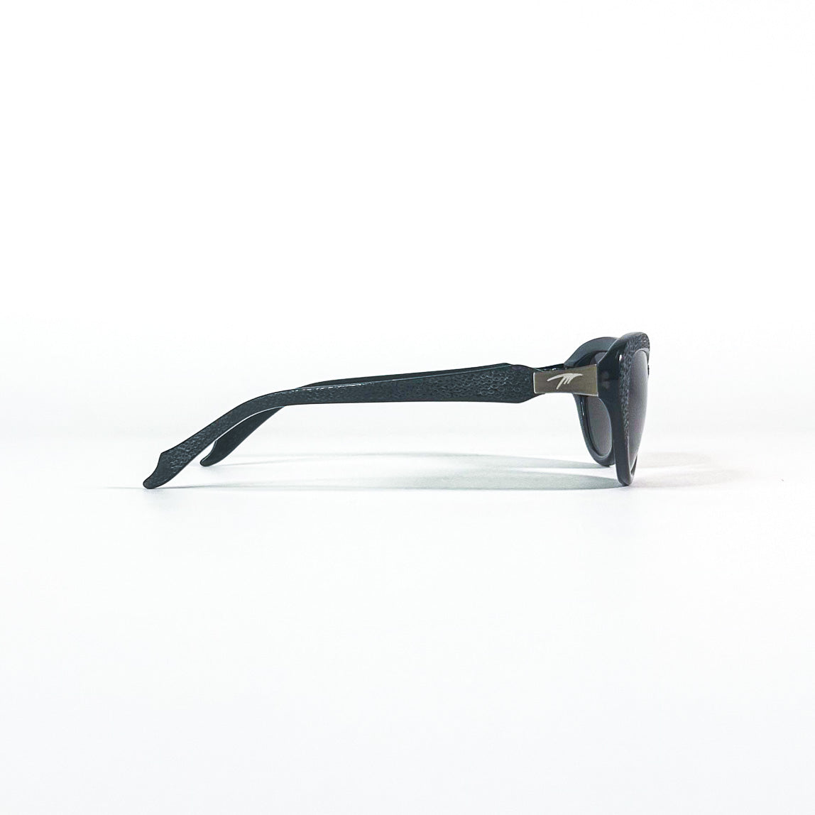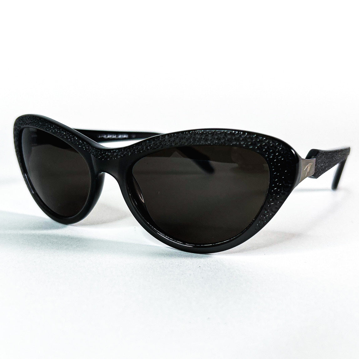 Lunettes de soleil Thierry Mugler TM 9322, forme œil de chat, en acétate noir texturé avec verres foncés, style années 2000, décorées de motifs gravés sur le contour.