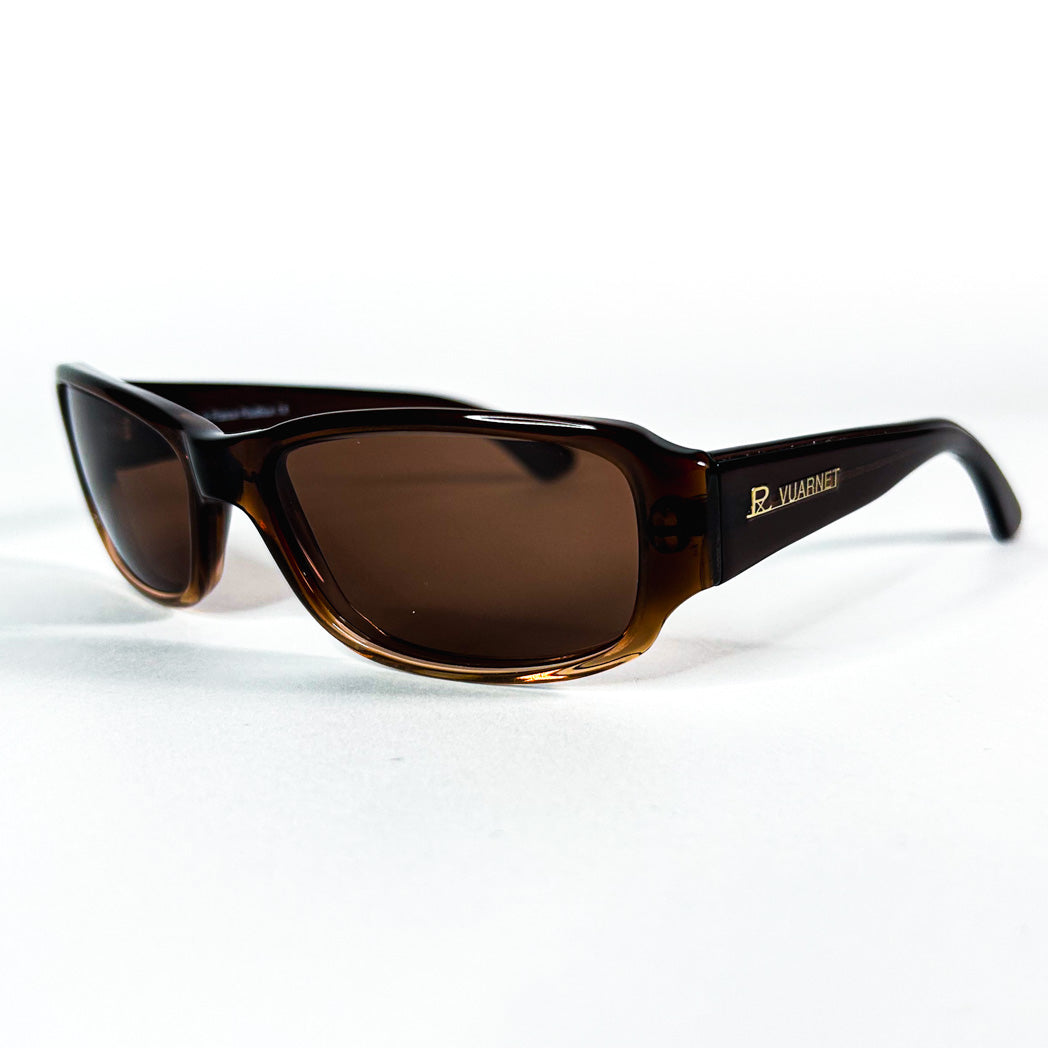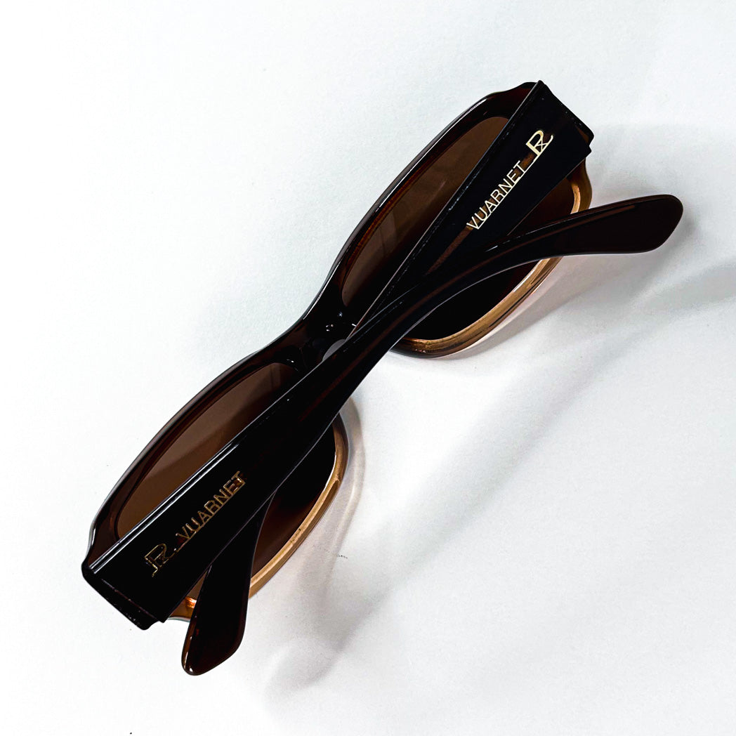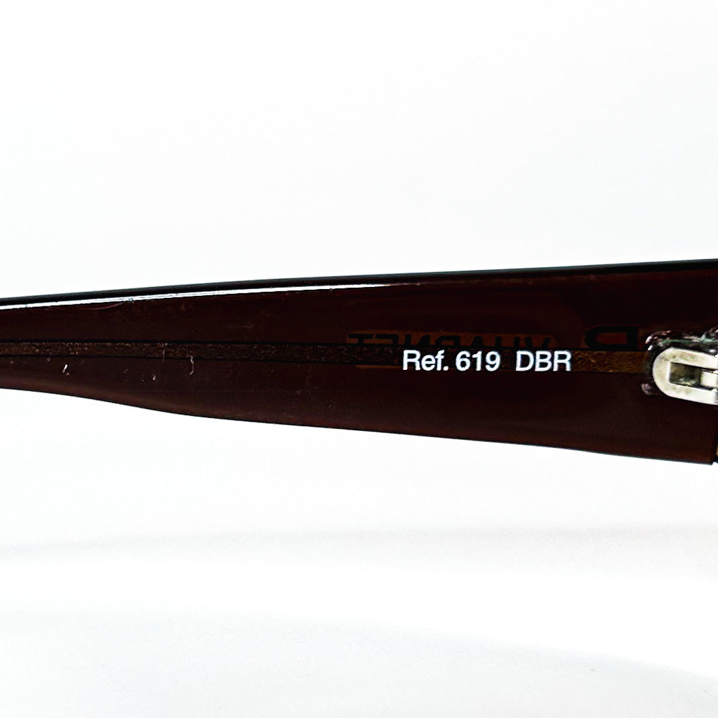 Fabriquées en France (marquage Handmade in France Pouilloux), ces Vuarnet réf. 619 DBR appartiennent à la période où la maison, fondée par Roger Pouilloux et le skieur Jean Vuarnet, produit des montures en acétate associées à ses verres minéraux réputés.